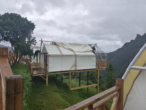 福建省武夷山旅行社深入政和縣天村稠嶺露營地,對帳篷及大型家具物品進行加固和檢查,拆除露營地帳篷外帳,轉(zhuǎn)移帳篷物資,檢查排水管道,設(shè)置警戒線,做好臺風防御工作。
