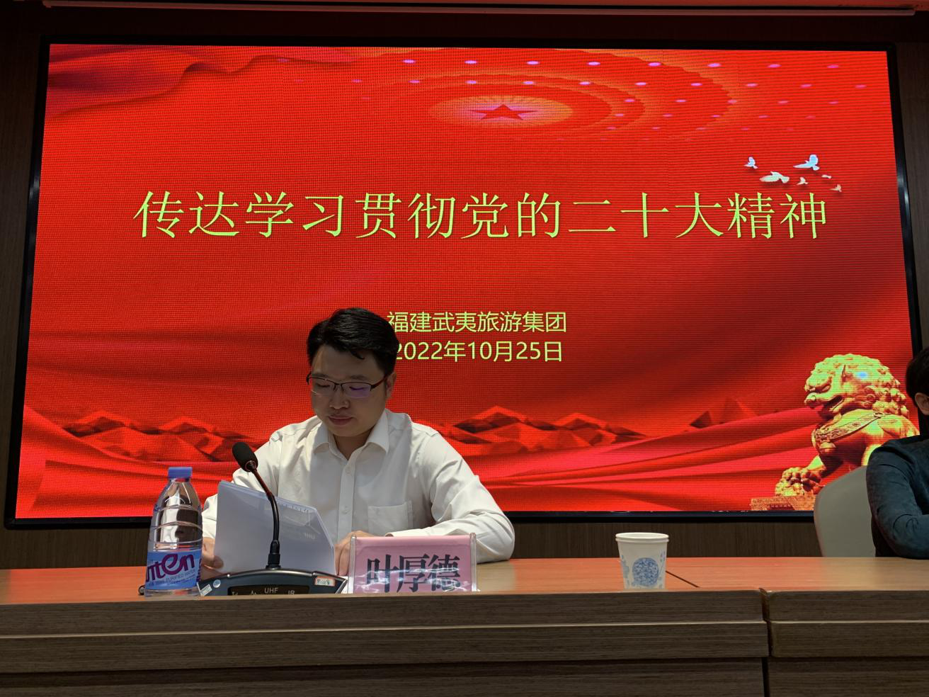 10月25日,福建武夷旅游集團(tuán)黨委書記、董事長葉厚德主持召開干部職工會(huì)議,迅速傳達(dá)學(xué)習(xí)黨的二十大精神,以及省委、市委常委會(huì)(擴(kuò)大)會(huì)議部署要求,對集團(tuán)學(xué)習(xí)宣傳貫徹黨的二十大精神工作作出部署。集團(tuán)領(lǐng)導(dǎo)班子成員、在潭子企業(yè)負(fù)責(zé)人、集團(tuán)本部全體員工參加會(huì)議。